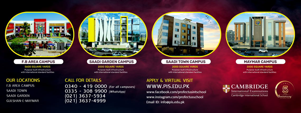 Profectus International School officially acquired in February, 2020, aims to advance and sustain a learning environment based on the ethos of collaboration and respect. At our campuses located at (5700 Square yards F.B Area Campus) (2000 Square yards Saadi Town, Saadi Garden & Gulshan-e-Maymar Campuses) we embrace and value the diversity of our staff and students belonging to different ethnicities and cultural background.